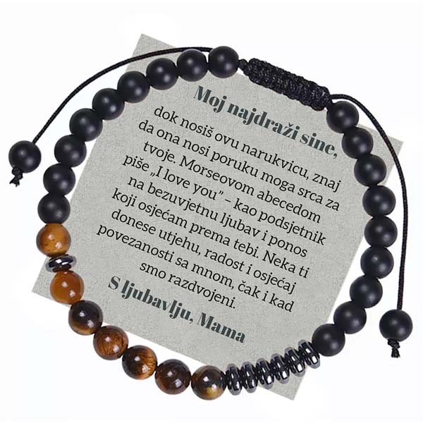 dok nosiš ovu narukvicu, znaj da ona nosi poruku moga srca za tvoje. Morseovom abecedom piše ,,I love you” – kao podsjetnik na bezuvjetnu ljubav i ponos koje osjećam prema tebi. Neka ti donese utjehu, radost i osjećaj povezanosti sa mnom, čak i kad smo razdvojeni.