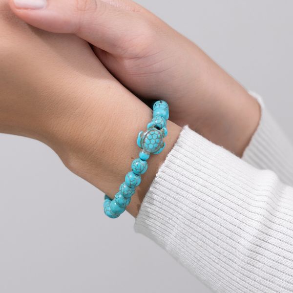 Ova prekrasna narukvica s tirkiznim perlama i motivom kornjače puna je značenja jer su morske kornjače poznate po svojoj mudrosti, strpljenju i izdržljivosti. Kada nosite ovu značajnu narukvicu s motivom morske kornjače, ona također pruža osjećaj povjetarca koji podsjeća na plažu. Perle su tirkizne i rastezljiva, a zajedno ih drži snažno uže. Tirkizna morska kornjača pliva u niti ovih svijetloplavih perli i tako tvori neodoljivi modni dodatak.